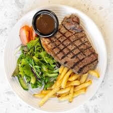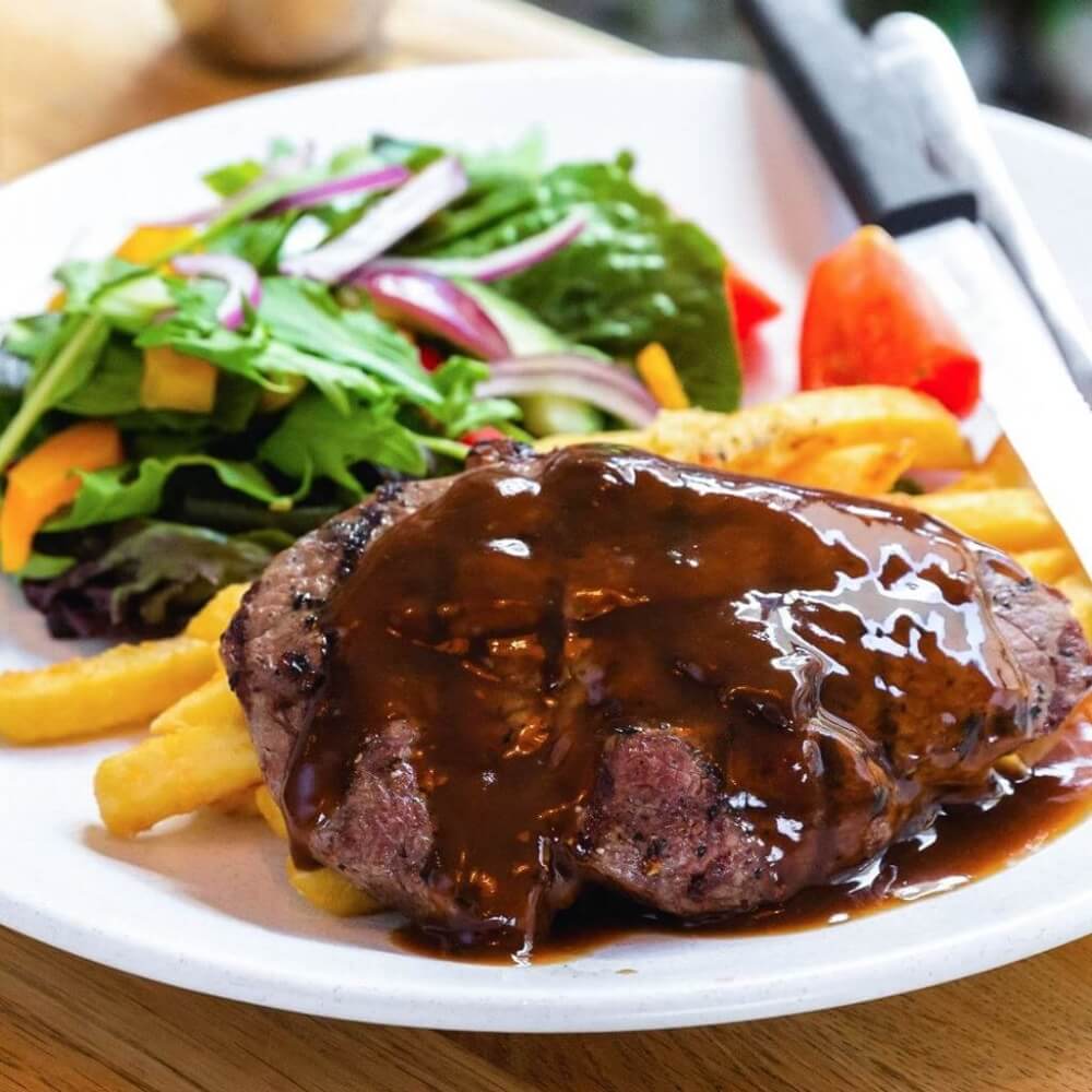 Served with your choice of potato mash or chips and salad or steamed vegetables