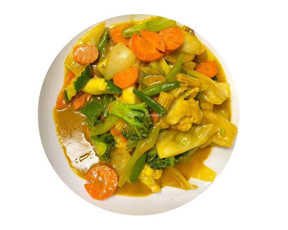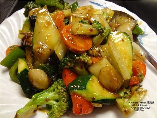 with carrot, cabbage, onion, zucchini, cooked with garlic sauce